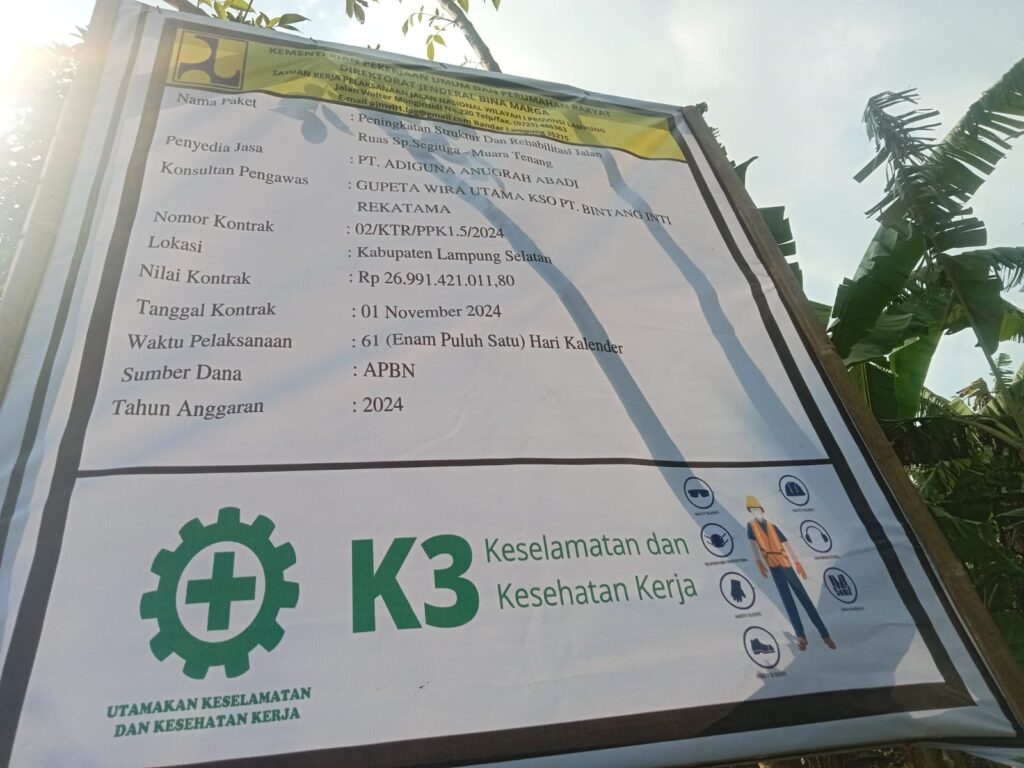 Lampung Selatan – Balai Pembanguan Jalan Nasional ( BPJN )  Lampung melaksanakan pengerjaan Paket Preservasi Ruas Blambangan – Palas Jaya (R.022), Kabupaten Lampung Selatan. Ruas Blambangan – Palas Jaya sepanjang 5,02 Km ,yang menelan Anggaran 26 M Lebih yang di kerjakan oleh PT.Adiguna Anugrah Abadi ( PT.AAA ) Dengan masa akhir pekerjaan 12 Desember 2024.
