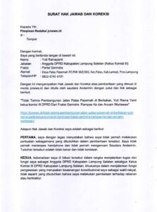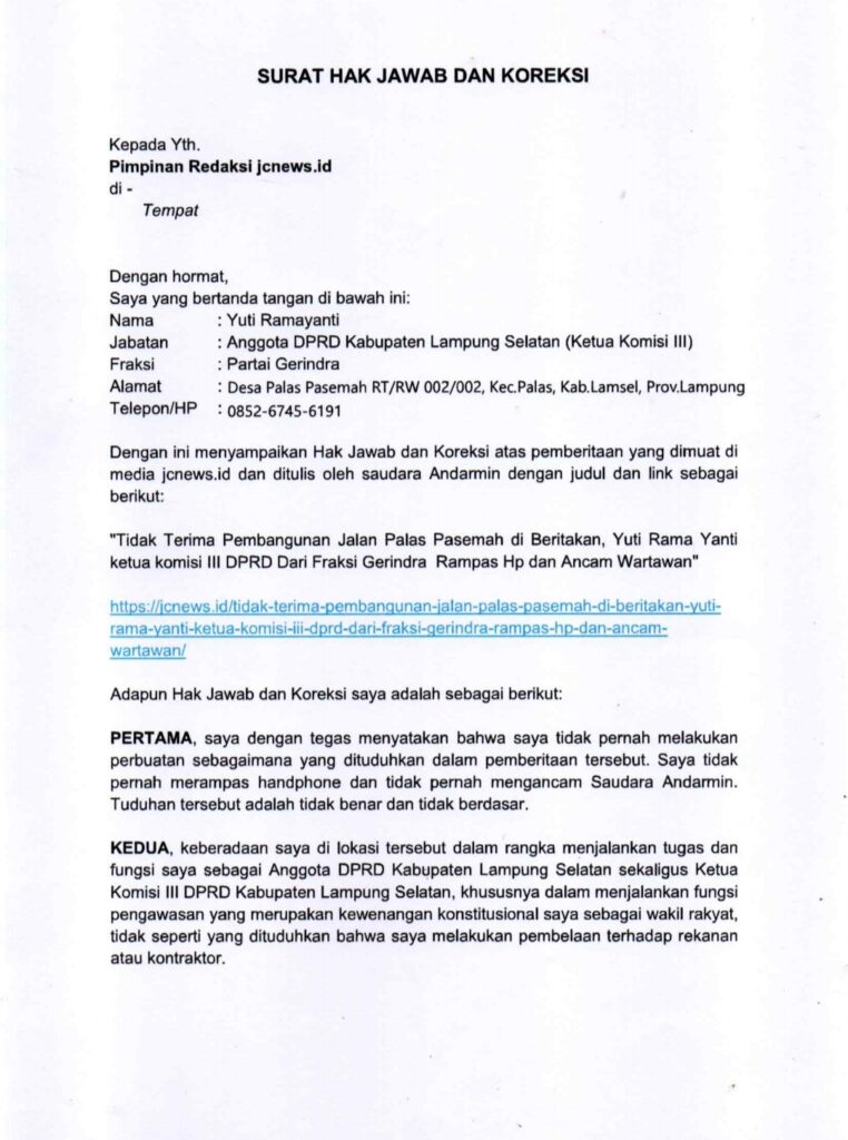 Yuti Rama Yanti Ketua komisi III DPRD Lampung Selatan kirimkan Hak jawab Secara tulis ke media Jcnews.id melalui pesan WhatsApp yang dikirimĀ  sodara Ahyar berikut isi dari Hak jawab dan koreksi yang di sampaikan pada Sabtu sore tgl.8 November 2025.