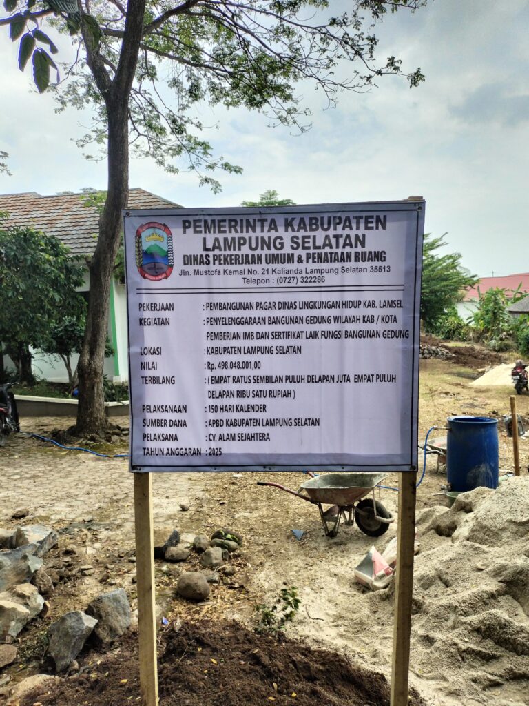 pembangunan pagar Dinas Lingkungan Hidup Pemerintah Kabupaten Lampung Selatan Kegiatan Penyegaran Bangunan Gedung wilayah Pemkab/Kota,pemberian IMB dan Sertifikat Laik Fungsi Bangunan Gedung dengan nilai kontrak Rp.498.048.001,00 sumber Dana APBD Kabupaten Lampung Selatan yang di kerjakan oleh CV.Alam Sejahtera diduga mengunakan Batu Bekas.Rabu.30 juli 2025.