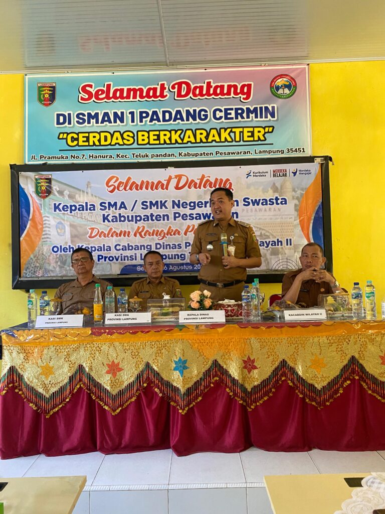 Kepala Dinas Pendidikan dan Kebudayaan Provinsi Lampung, Thomas Amirico, S.STP., S.H., melaksanakan kegiatan pembinaan bagi seluruh kepala sekolah jenjang SMA/SMK Negeri dan Swasta se-Kabupaten Pesawaran. Kegiatan berlangsung di SMAN 1 Padang Cermin, Kabupaten Pesawaran, pada Selasa, 26 Agustus 2025.