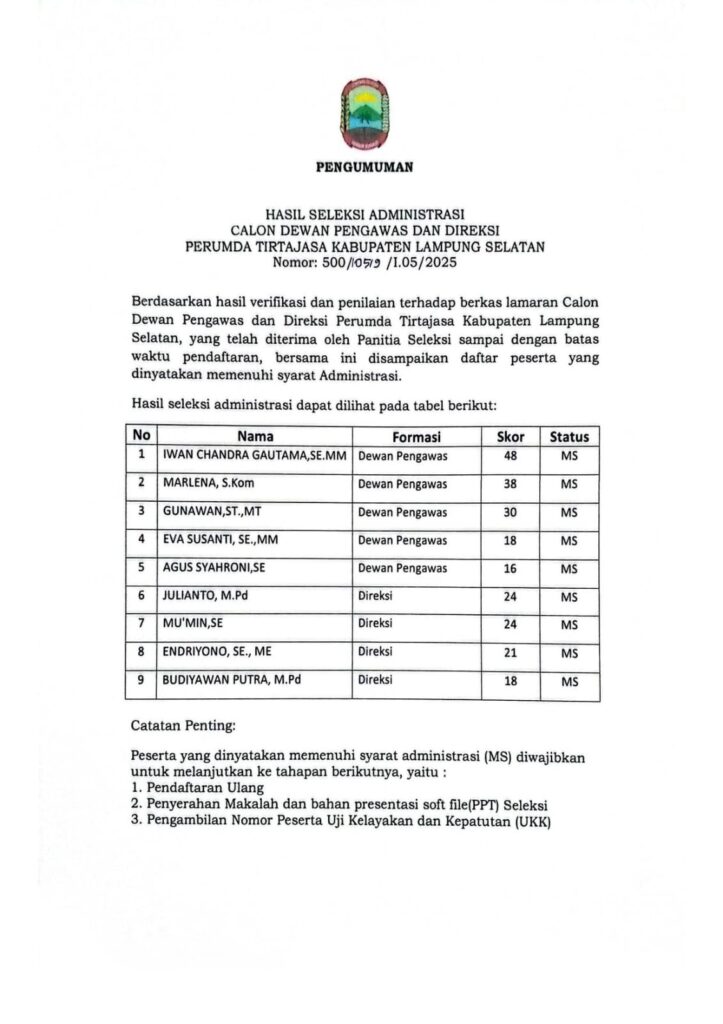 Permainan tersebut terbukti dengan adanya pemberitaan media online sore jumat tgl. 12 Desember 2025, dengan judul 10 peserta di Nyatakan MS Administrasi Calon Pengawas dan Direksi Perumda Tirta Jasa.